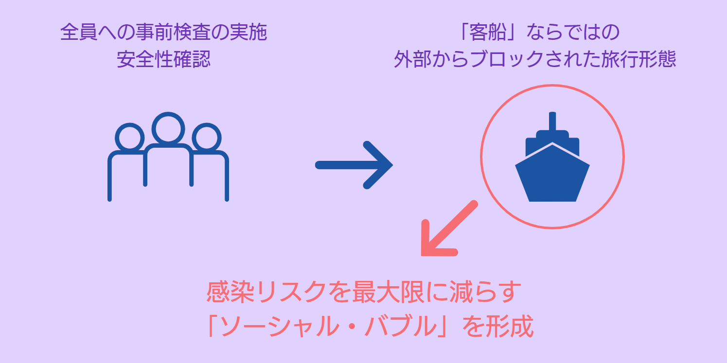 これにより、外部からブロックされた「クルーズ」というユニークな旅行形態ならではの「ソーシャルバブル」を形成し、感染リスクを最大限に減らします。